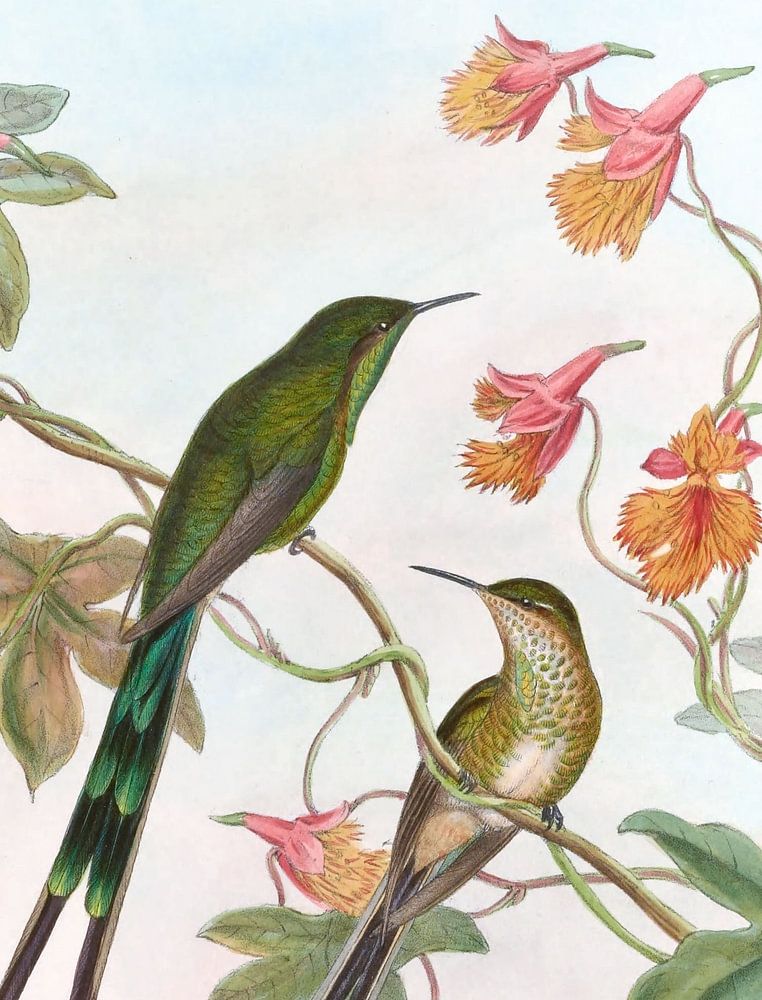 Train-bearer (Lesbia eucharis), John Gould It may be thought by some persons that the Leshia Eucharis and L. Amaryllis are one and the same species, but a comparison of the two birds will readily prove that such is not the case, and that M. Bourcier’s view of the subject in separating them was correct. This illustration has been restored to its original vibrancy by enhancing colors and removing unwanted marks. A monograph of the Trochilidæ, or family of humming-birds was published between 1849 and 1887 by English ornithologist John Gould. This monumental work depicts and describes all the known species of hummingbirds at the time - comprising 418 lithographic plates and information on 537 species."