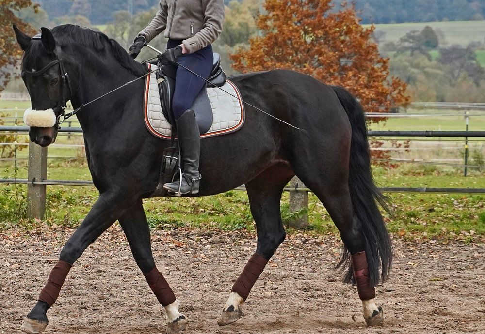 About "Training with the Bayer black horse Baveria on a riding arena in autumn"