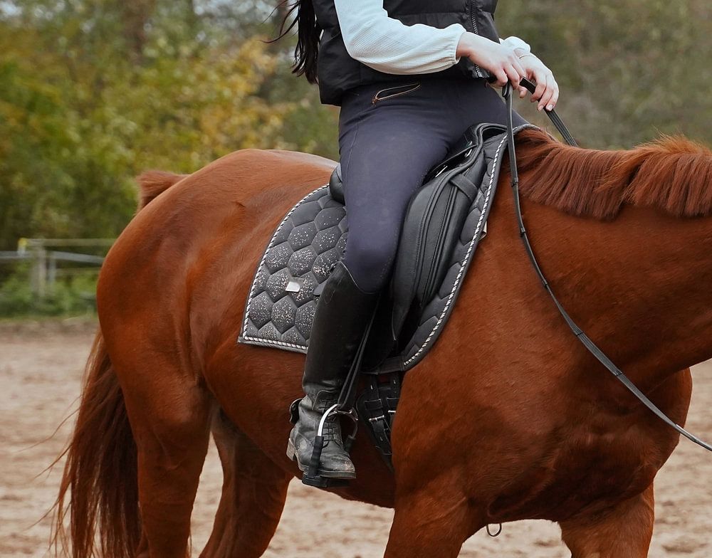 Training with the bay Oldenburg mare on a riding arena by Babetts Bildergalerie