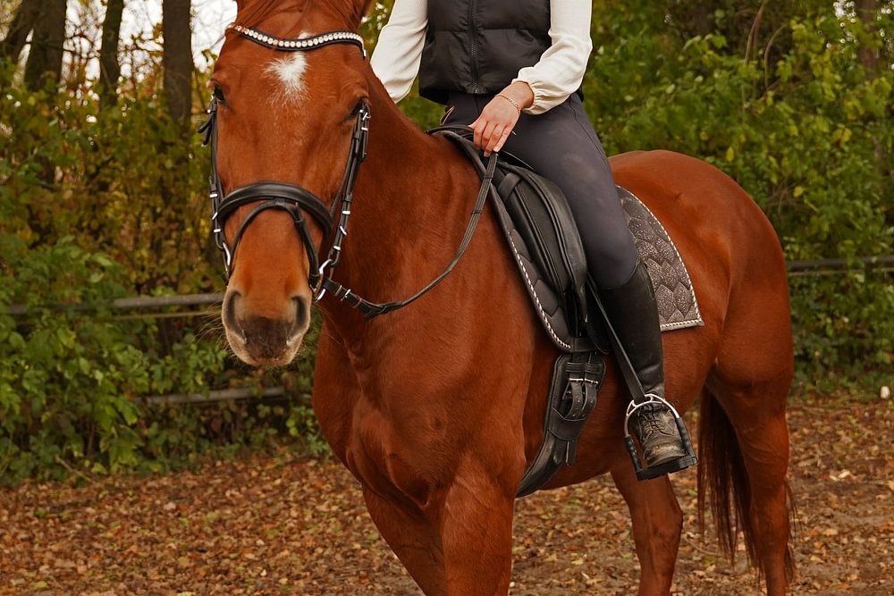 red-brown Oldenburg mare and rider training on the riding ground in Bavaria