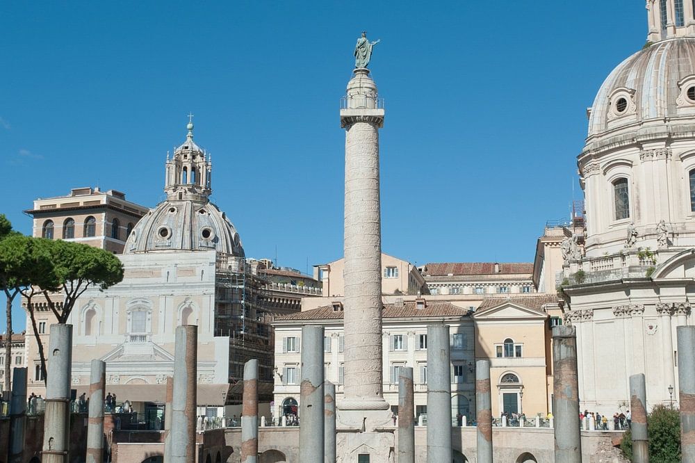 Rome Italy. Ruins of Trajan's Forum, Trajan's Column (Colonno ) Traiana and Church of the Most Holy Name of Mary at the Trajan Forum (Santissimo Nome di Maria al Foro Traiano)