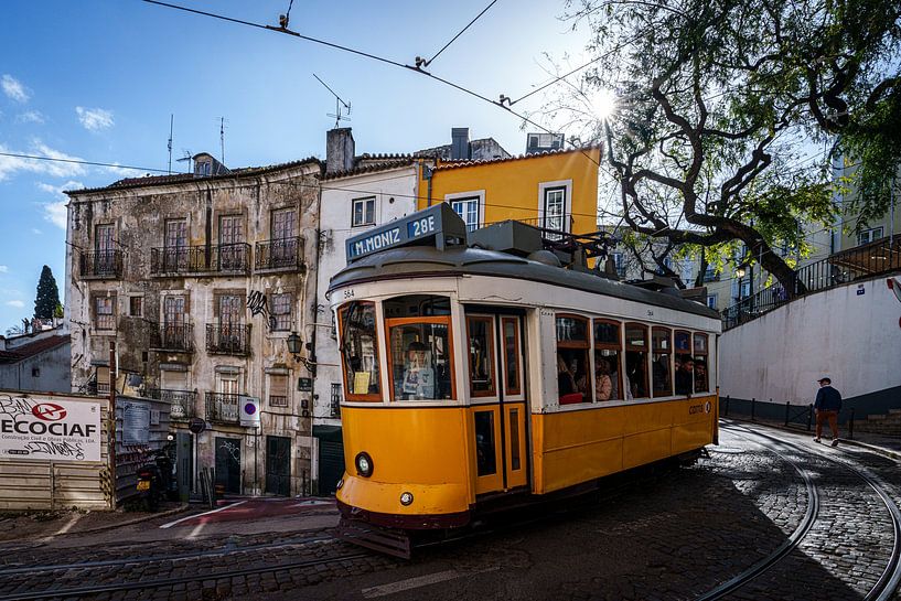 A characteristic sight in Lisbon: tram 28 is a historic, iconic yellow tram that winds its way through the narrow, steep streets of the Alfama, Baixa, Estrela and Graça districts.