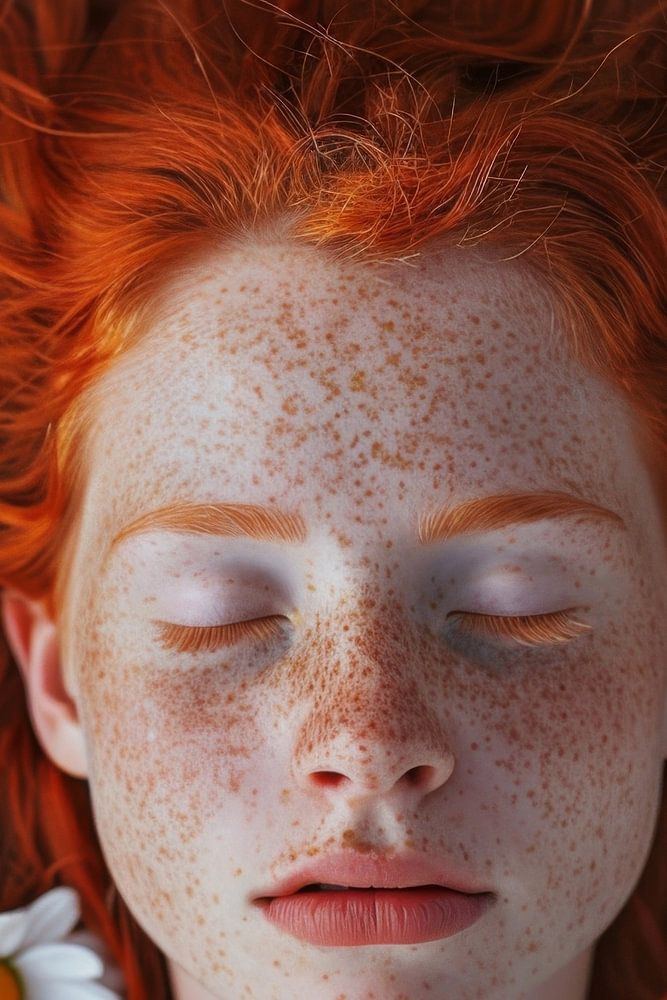 A delicate portrait shows a girl with bright red, curly hair lying gently on a bed of daisies. Her somnolent expression and the numerous freckles give her a fairytale-like aura. In this harmonious composition, nature and beauty merge into a dreamy moment of tranquillity.