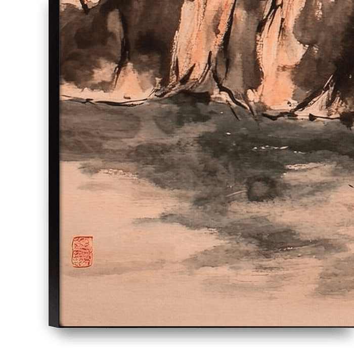 Gentle waves reflect the majestic play of light and shadow, while a bright red sunset bathes the horizon in a warm light. Exquisite rocks rise mystically from the mist, framed by a tranquil atmosphere. This work of art lends your living room a meditative elegance and invites you to dream.