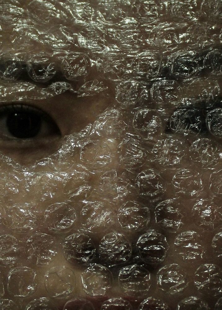 A striking conceptual photograph portraying a human face obscured by bubble wrap. This layered image evokes emotions of isolation, entrapment, and fragility. The use of a mundane protective material adds tension and meaning—inviting viewers to reflect on emotional barriers and modern alienation. Perfect for lovers of psychological, modern, or abstract portraiture.