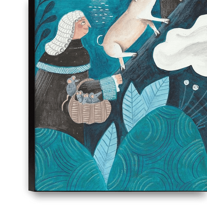 An illustration where there is much to see, a journey through the night. Wise judges discover the stars and mother and child are reunited. Basket of mice and pig go along too. All this in shades of blue. Original acrylic paint on paper.