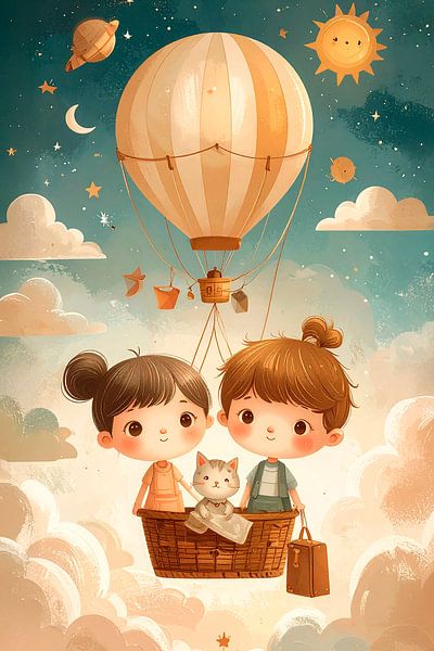An illustration of two small children, a boy and a girl, travelling together in a hot-air balloon. They carry a travelling suitcase and their cat they also take with them. Floating among the clouds, they enjoy their friendship, pure and real, a magical moment. The soft colours and warm glow makes the scene even more dreamy. The image…