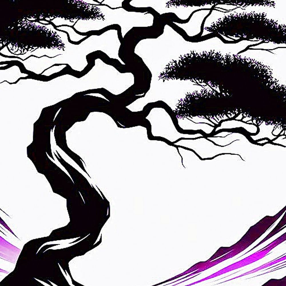Japandi-style illustration of a lone tree in a landscape with purple mountains. Created with A,I. art and edited digitally with Photoshop.