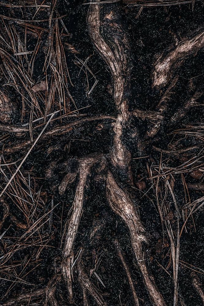 An abstract photograph of tree roots in the forest.
