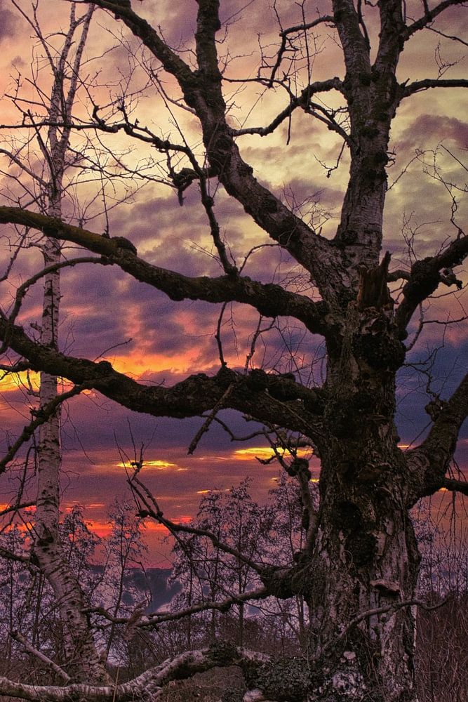 A beautiful gnarled tree in a field, lit by the evening sun on rainy clouds.