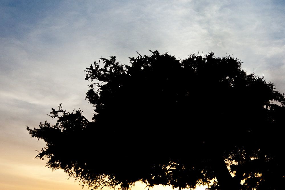 Silhouette of a tree at sunset. The sky turns beautiful yellow and blue.