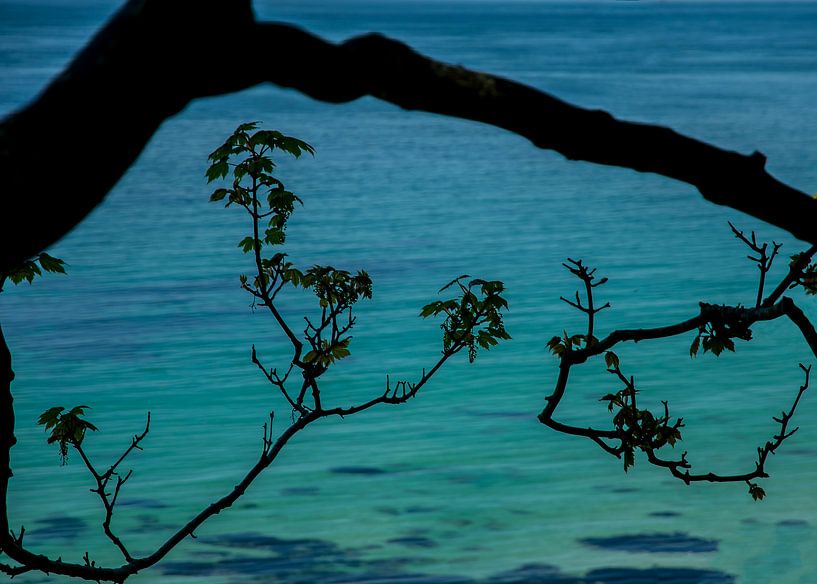 View of a turquoise blue sea with in the foreground (the silhouette of) a tree branch.