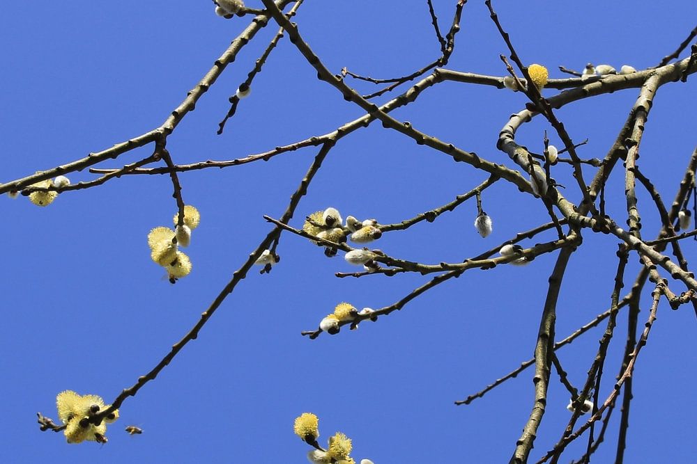 The branches of the tree are studded with yellow buds. The sky is bright blue. It is spring.