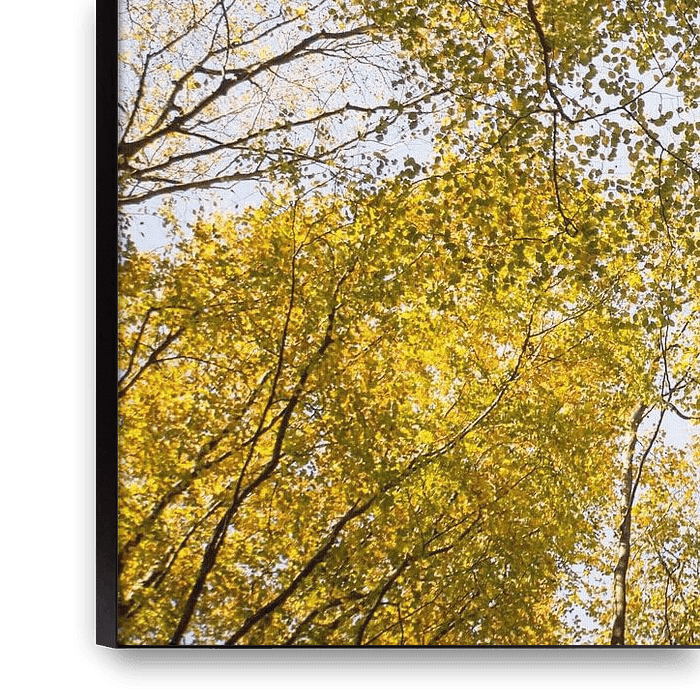 Buy the photo Tree canopies with beautifully coloured autumn leaves against a blue sky by Birgitte Bergman on canvas, ArtFrame, poster and wallpaper, printed on demand in high quality.