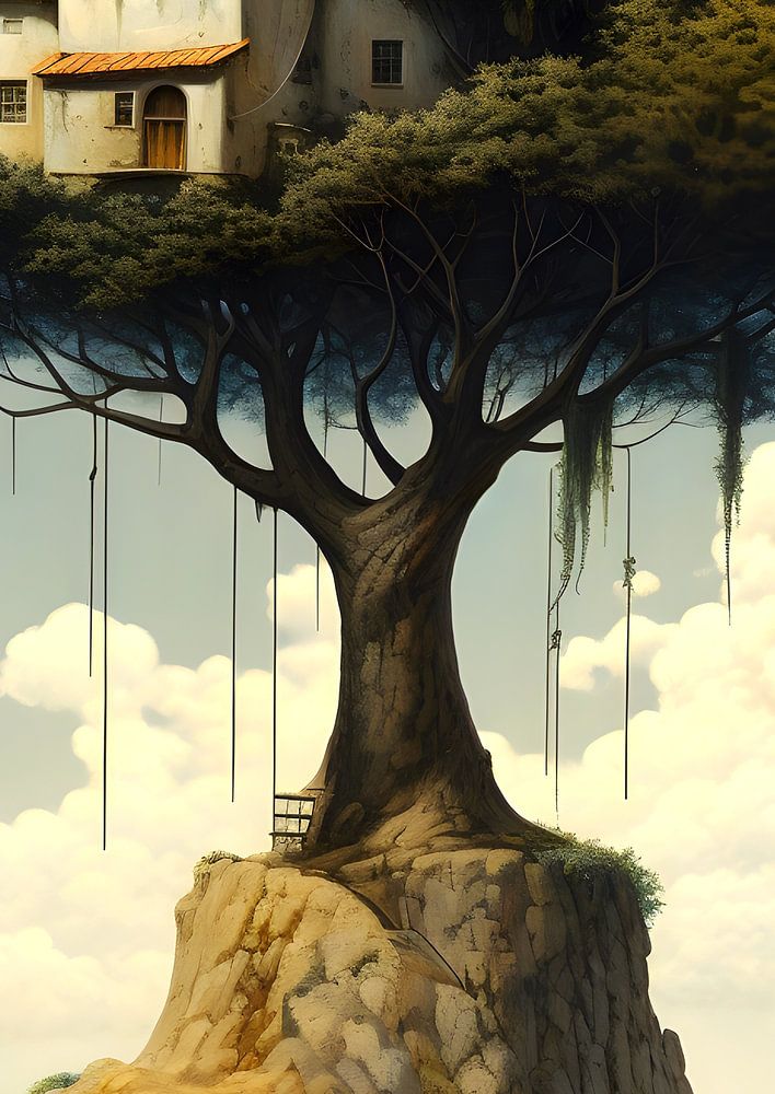 Buy this painting Tree house, tree house, surrealism by Jan Bechtum as a reproduction on canvas, ArtFrame, poster and wallpaper, printed on demand in high quality.