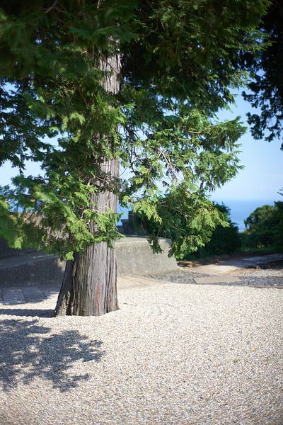 Tree in Japanese garden, Odawara, Japan. This photograph was taken in the Japanese garden at the Odawara Observatory. The sea can be seen in the background.