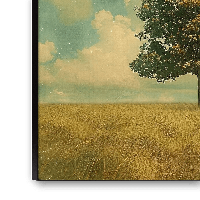 This design exudes a sense of calm and serenity, perfect for anyone looking for a moment of relaxation in their daily lives. The image shows a lone tree standing proudly in a vast field under a beautiful, bright blue sky with floating clouds. The soft colours and simple composition make this artwork a perfect addition to any interior, especially in spaces where peace and quiet are desired, such as a bedroom or a dining room. The vintage and serene atmosphere evoked by this artwork makes it a timeless choice for lovers of minimalist and nature-inspired decoration.