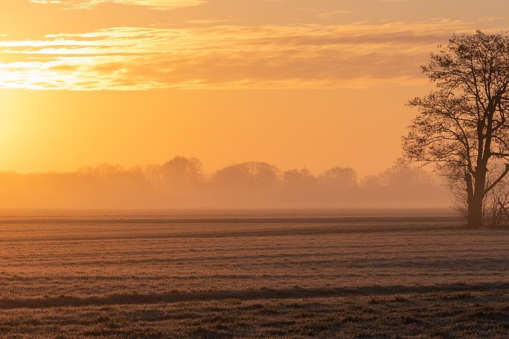Buy this landscape artwork Tree in the field during sunrise by Durk-jan Veenstra on canvas, ArtFrame, poster and wallpaper, printed on demand in high quality.