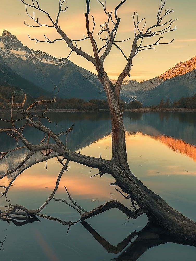 Buy this landscape artwork Tree in the lake by fernlichtsicht on canvas, ArtFrame, poster and wallpaper, printed on demand in high quality.