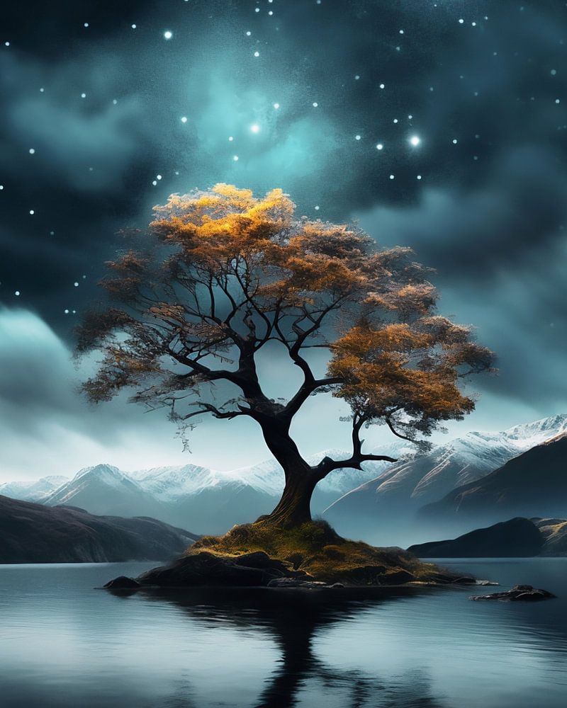 Buy this landscape artwork Tree in the night sky by Arndt-Christoph Föcks on canvas, ArtFrame, poster and wallpaper, printed on demand in high quality.