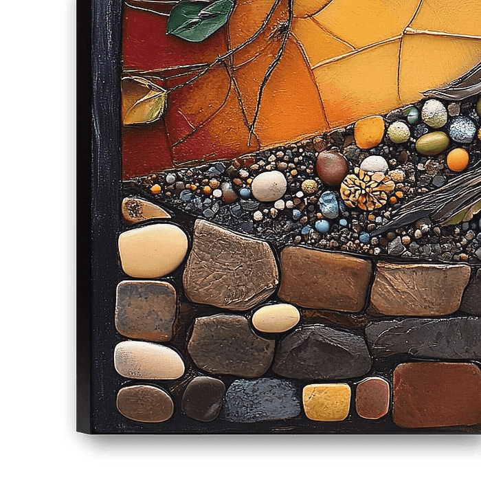 "Tree of Life's Seasons" is a vibrant depiction of the cyclical nature of life, expressed through the changing seasons. The tree, with its branches spreading across a colorful mosaic of hues, symbolizes growth, renewal, and the passage of time. Each quadrant of the artwork represents a different season, reminding us of the beauty in every stage of life. The intricate textures and rich colors invite viewers to reflect on the interconnectedness of all living things.