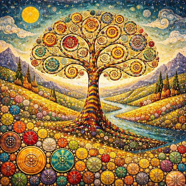abstract hills with decorative circles and tree of life....Inspiration Gustav Klimt