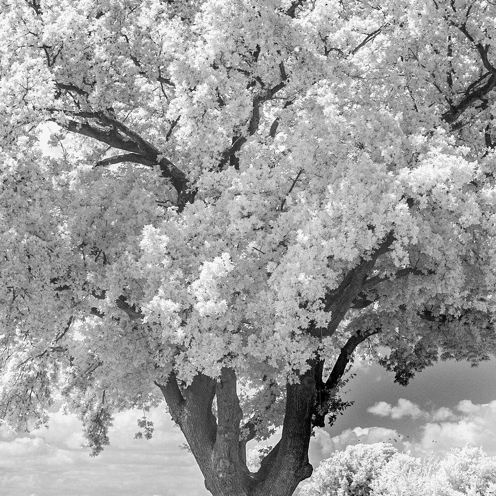 The effect of infrared makes it look like the trees are full of ice and standing in a snowy landscape.