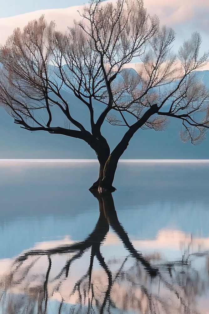 Buy this landscape artwork Tree reflection in the lake by fernlichtsicht on canvas, ArtFrame, poster and wallpaper, printed on demand in high quality.
