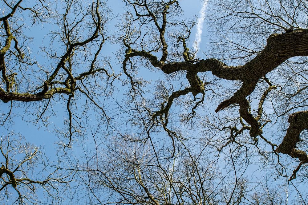 Look up when walking in the forest. So beautiful those silhouettes against the sky. Especially when it is as brilliantly blue as in this photo. The smallest branches, sinuous trunks and branches of big old trees stand out darkly against the cloudless sky. a plane has left a plane mark.
