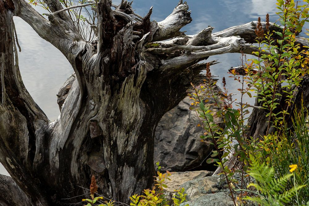 Tree trunk in front of the sea with reflections of the sky