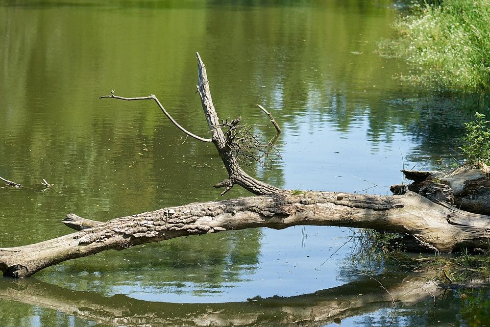 Natural landscape with water and a fallen tree in today's Adolf-Mittag-See, a former tributary of the Elbe, the so-called deaf Elbe near Magdeburg.