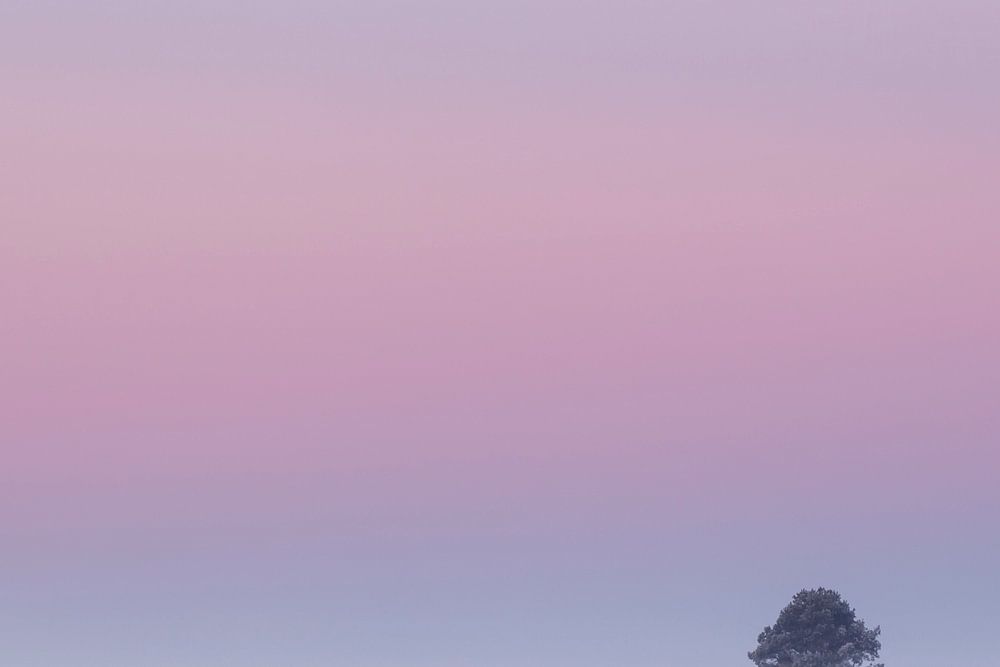 Lonely tree on a cold white winter morning under a fantastic sky in pink and blue. The frost and some fog provided in the white grasses and heath.