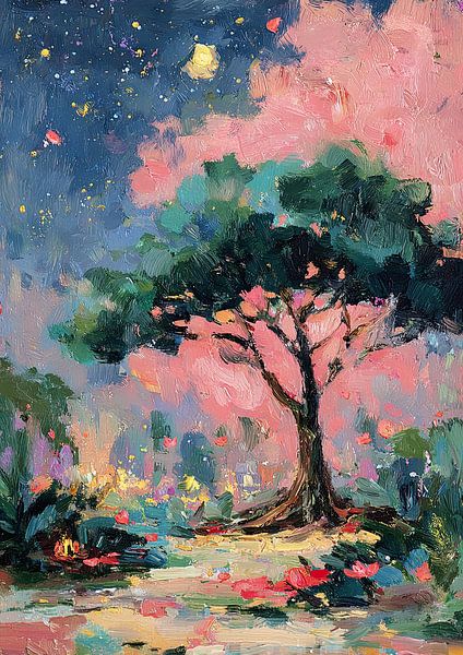 This atmospheric, impressionistic painting captures the magic of a starry night. At its centre stands a mighty tree in deep blue and green hues, its shadow falling on a bright path. A bright yellow full moon towers above soft, pink cloud formations, while countless points of light dot the violet night sky like stars. Dabs of red and…