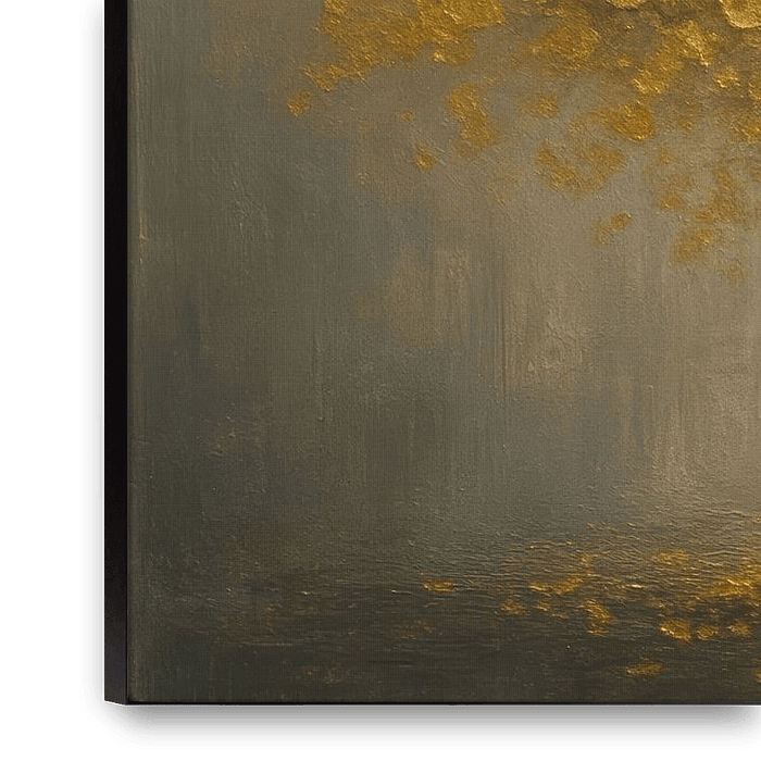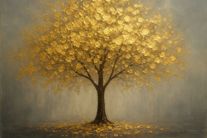 A solitary tree with shimmering, golden leaves takes centre stage against a soft grey-blue background. The sturdy silhouette of the trunk contrasts beautifully with the sparkling crown of leaves, while scattered leaves on the ground suggest subtle movement. The light seems to dance across the metallic sheen, creating depth and texture…