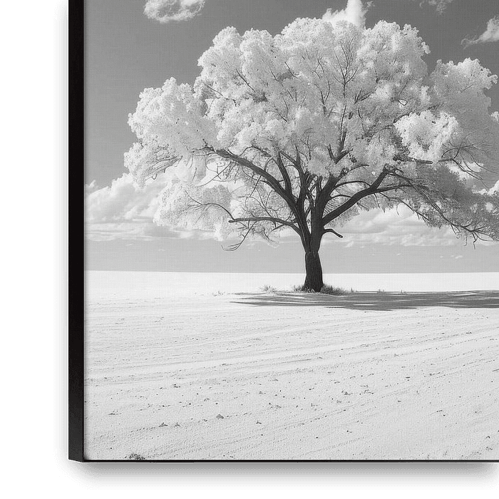 This mesmerising artwork captures the sublime beauty of a solitary tree in a vast snowy landscape, masterfully captured in black and white. The dramatic shadows of the tree stretch across the snow, creating an impressive interplay of light and darkness. The dramatic cloud formations and dazzling sunlight add an extra layer of depth and…