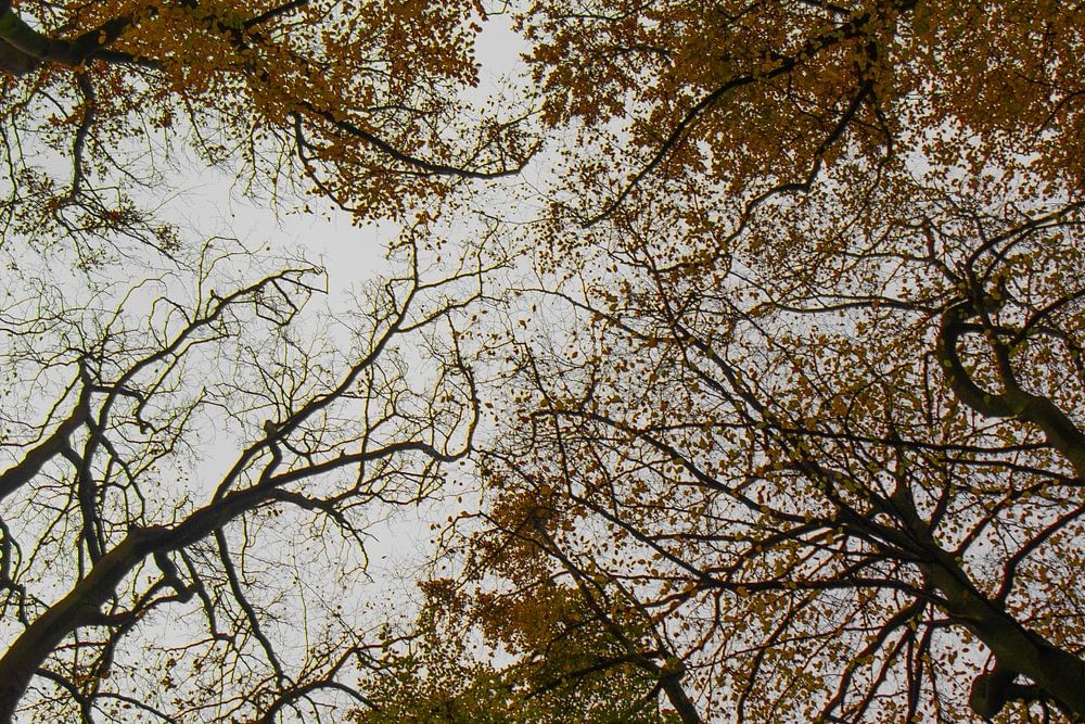 The trees are felling, but most of them still have leaves. From the four corners, the trunks of the trees run towards the middle. The leaves have beautiful autumn colors.