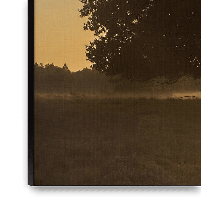 Nuilerveld in Drenthe is a special nature reserve where heathlands, forests and fens meet. In the early morning, when the sun slowly rises, a soft mist often envelops the landscape. This photo shows a group of imposing trees bathed in the warm light of the rising sun. The mist catches the sunlight and spreads a golden glow throughout…