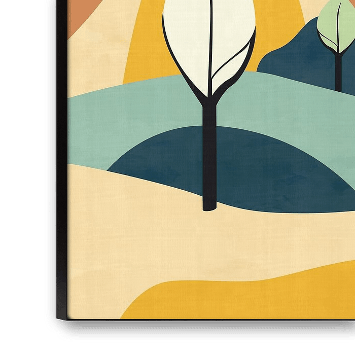 Minimalist illustration of a landscape inspired by the beauty of summer. It depicts the warmth and tranquillity of an afternoon with vibrant colors and a limited palette of yellow, orange, blue, green and anthracite.