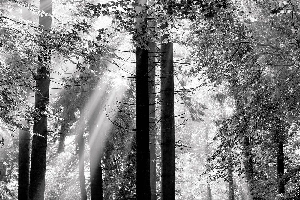 Trees in the forest where the sun's rays shine through branches and leaves in black and white.