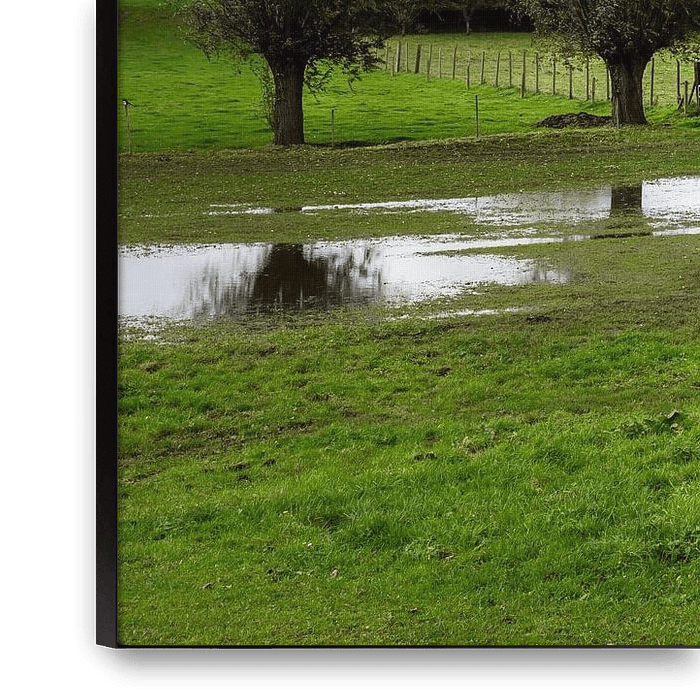 These trees reflect in the typical puddles of a meadow around Lennik, Pajottenland, Belgium