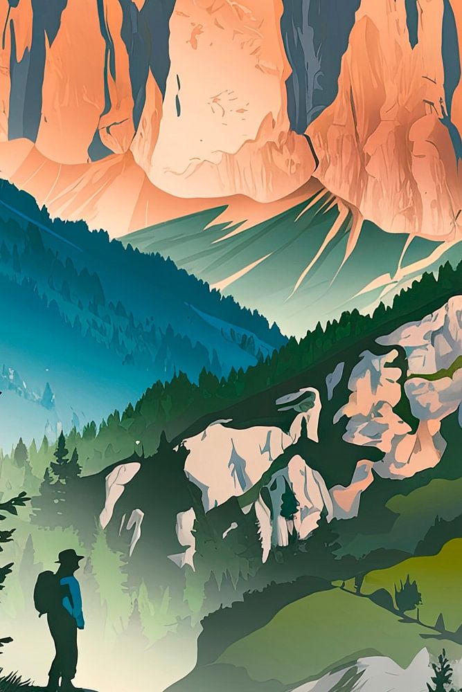 In the midst of majestic, bright orange-coloured peaks, nature rises powerfully and invitingly. A solitary hiker discovers the unspoilt beauty of Trentino-Alto, surrounded by lush greenery and rolling hills. The clear lines and warm colours create a harmonious atmosphere that encourages dreaming and exploration - a fantastic painting of the Italian Alpine landscape.