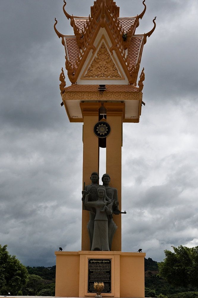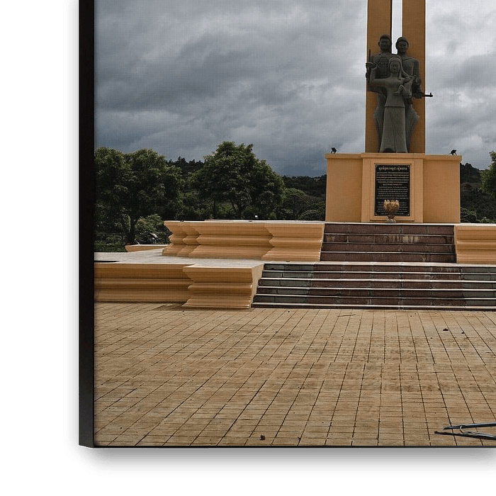 Built in the heart of Saen Monourom, this monument combines art, tradition and a universal message. Standing on a large, geometrically-shaped pedestal, a human sculpture in stone represents a family united around a book. This sculpted group evokes the transmission of knowledge, collective memory and the fundamental values of Cambodian society. Overlooking this scene, a golden tower topped with a traditional Khmer roof proudly dominates the esplanade. The dark sky in the background lends the whole a solemn, timeless dimension. Through its positioning and aesthetics, the monument acts as a strong marker of identity for the local population. It celebrates the importance of the family, education and culture as pillars of reconstruction and progress.