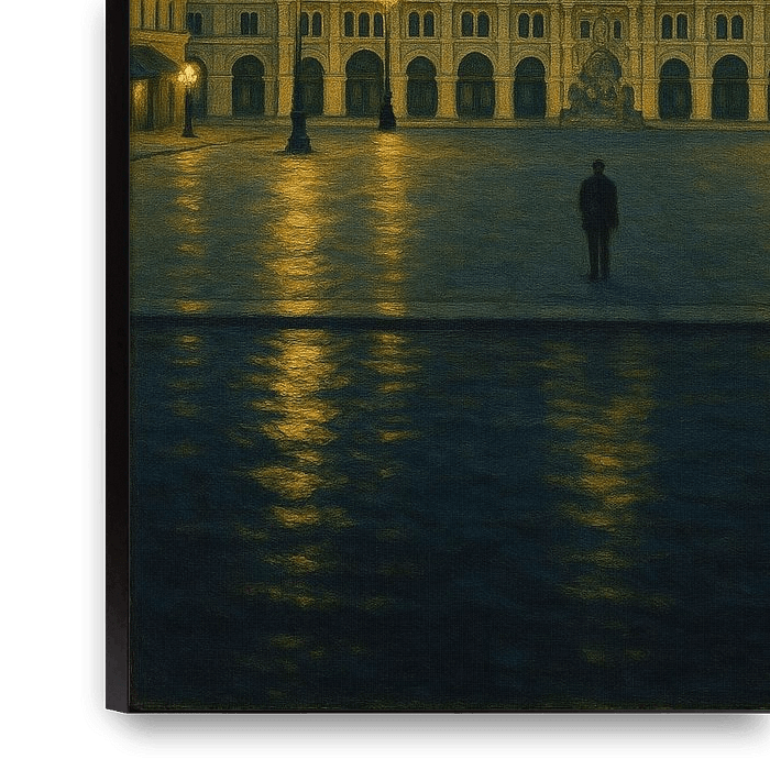 Trieste’s Nocturnal Glow reveals one of Italy’s grandest piazzas at its most introspective moment. The vast expanse of marble glimmers with reflected lamplight, and a lone figure stands at the edge, gazing toward the Adriatic horizon.