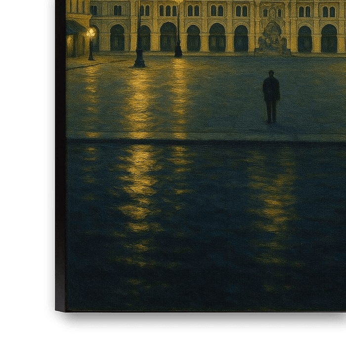 The artist captures Trieste as both stage and mirror: a place where modern isolation meets classical grace. It’s a painting about being small before something vast — a contemplation on solitude as elegance, silence as depth, and architecture as emotional language.