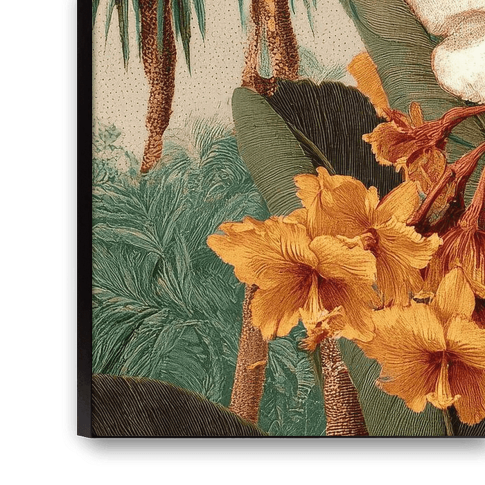 This sophisticated botanical illustration shows a tropical scene with large white and golden yellow flowers amid lush dark green leaves. In the background, slender palms gently sway with the exotic backdrop. The warm tones and detailed line structures give this artwork a classic look with a colonial flair. Ideal as wall decoration in a botanical, vintage or tropical interior.