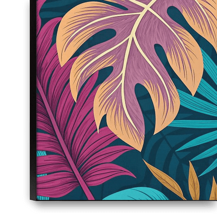 Immerse yourself in a lush paradise with this vibrant tropical foliage pattern. Featuring an array of exotic leaves in striking shades of teal, deep magenta, golden yellow, and hints of peach against a dark, rich background, this design evokes the beauty and mystery of a hidden jungle. Perfect for adding a touch of bold, natural…