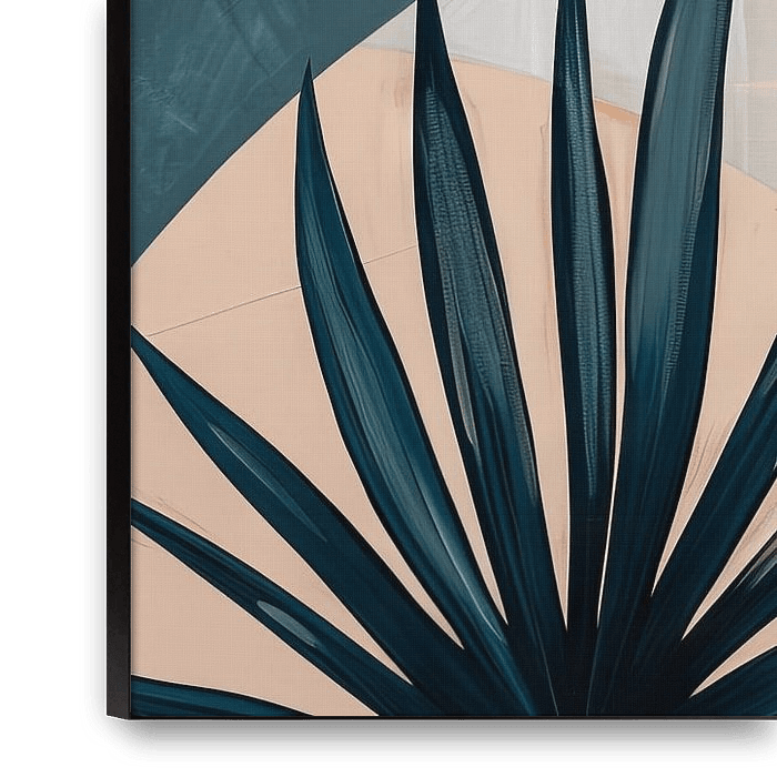 This modern painting combines geometric shapes with vibrant, tropical leaves to create a fascinating composition. The lush green tones of the leaves contrast harmoniously with the warm earthy colours and cool pastel tones in the background. The clear lines and balanced colour palette give the work a contemporary, calming aura. Inspired…