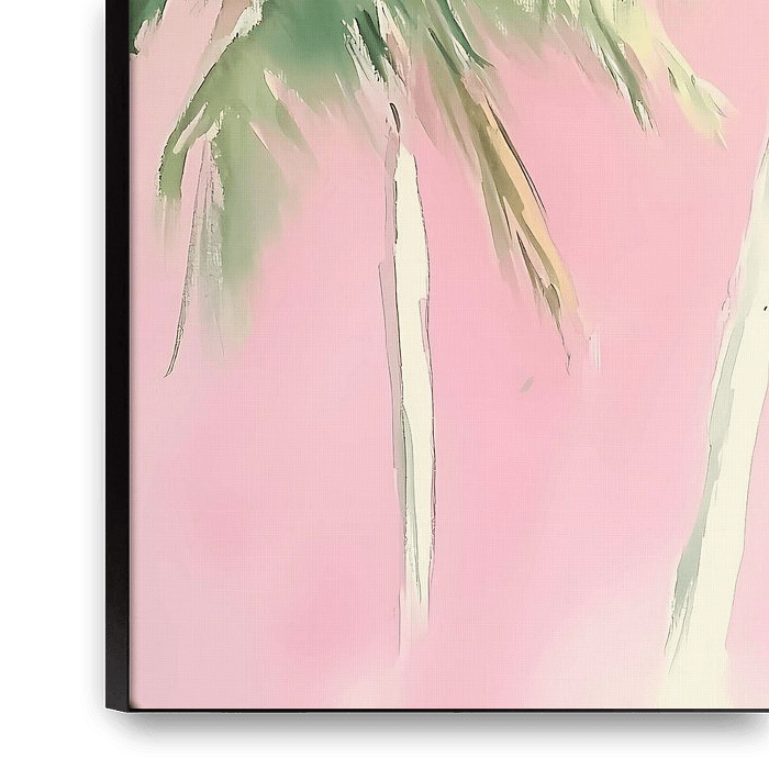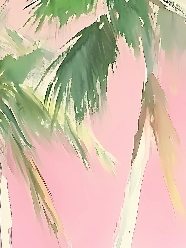 Soft, dreamy palm trees painted in airy brushstrokes against a warm pink backdrop evoke a relaxed tropical escape.