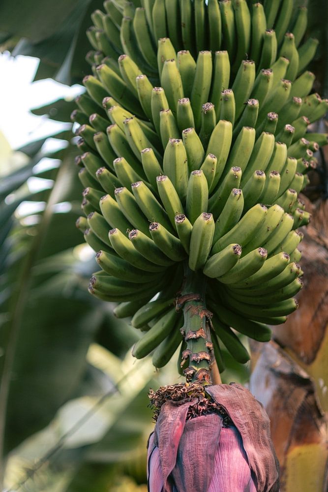 Nature photo of tropical banana trees, with a close-up of a banana flower. This photo was taken at a banana plantation on the sunny island of Tenerife (Canary Islands, Spain, Europe).