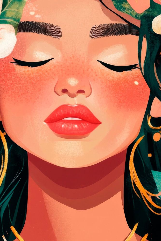 The picture shows an impressive, stylised woman with closed eyes, framed by bright flowers and lush greenery. Her golden earrings and necklaces radiate elegance, while the soft colours and harmonious composition create an atmosphere of calm and beauty. The contrast between the floral background and her radiant face is particularly striking.
